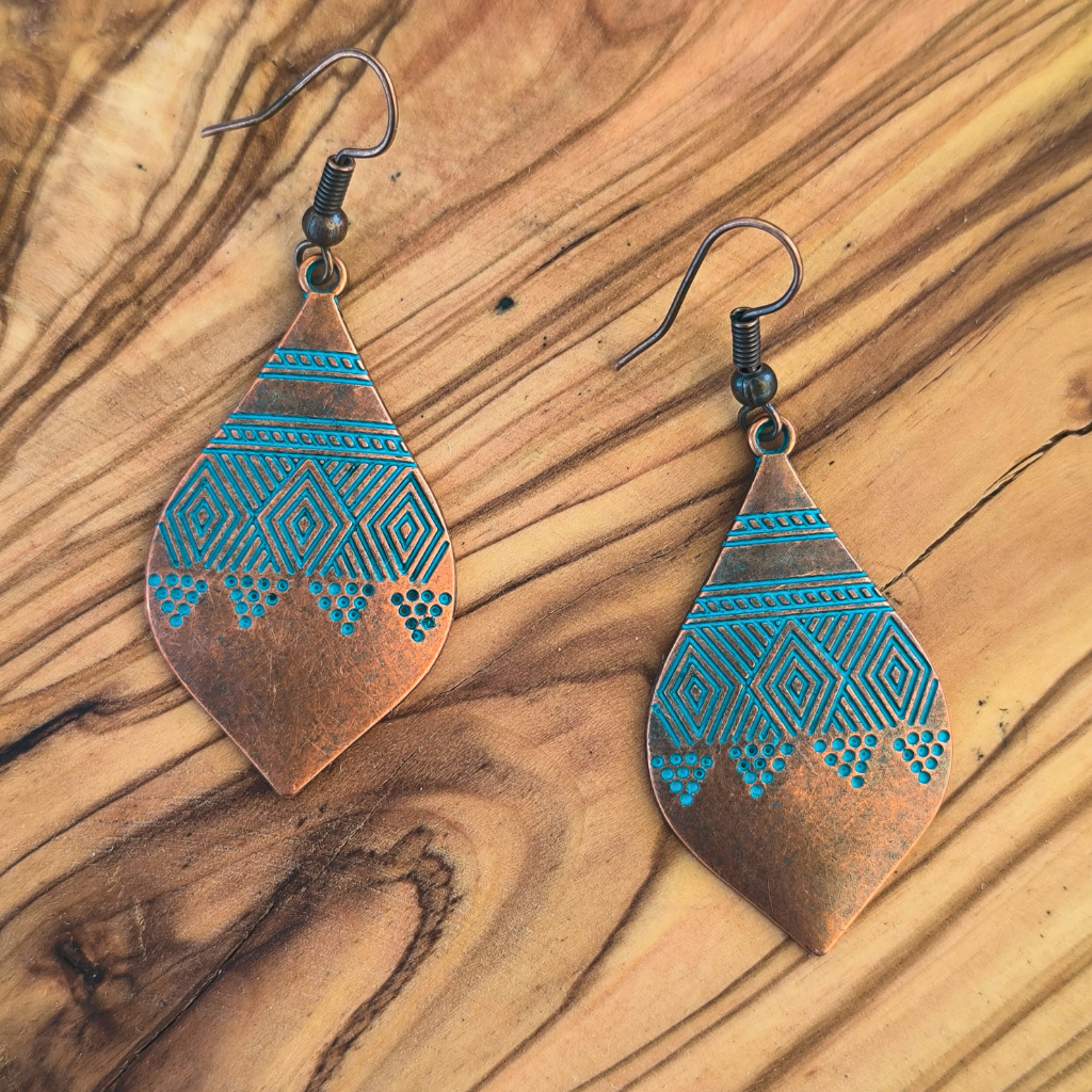 Ζωντανέψτε το στυλ σας με μεταλλικά σκουλαρίκια σε γεωμετρικό σχέδιο σταγόνων νερού. Το τυρκουάζ χρώμα προσθέτει μία δροσερή και ζωντανή αίσθηση, ενώ η έθνικ αίσθηση αποπνέει αυθεντικότητα και δυναμισμό. Ιδανικό για τις πιο τολμηρές εμφανίσεις που αγαπούν τον ιδιαίτερο χαρακτήρα και την ξεχωριστή αισθητική.
