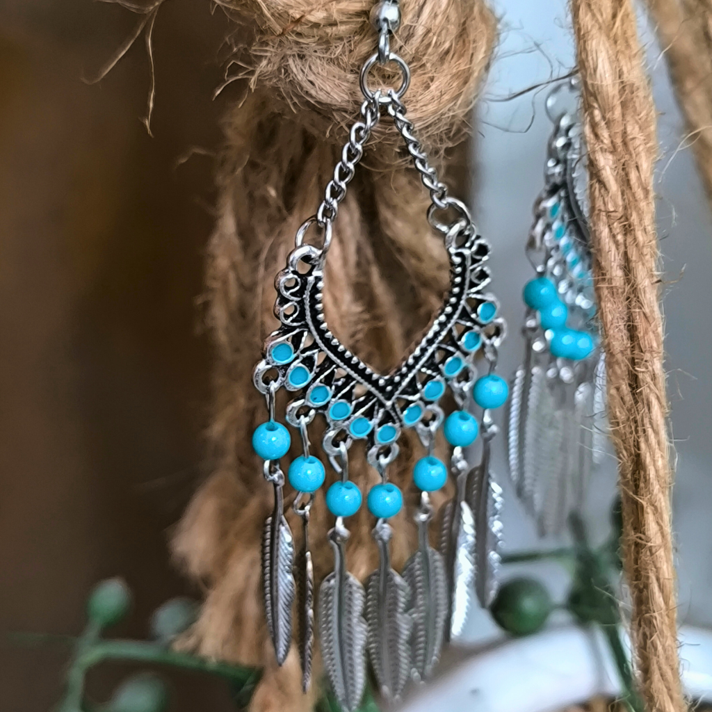 Ανακαλύψτε τη μαγεία του bohemian στυλ με αυτά τα μοναδικά σκουλαρίκια που συνδυάζουν το μπλε τυρκουάζ με ασημένια μεταλλικά στοιχεία.