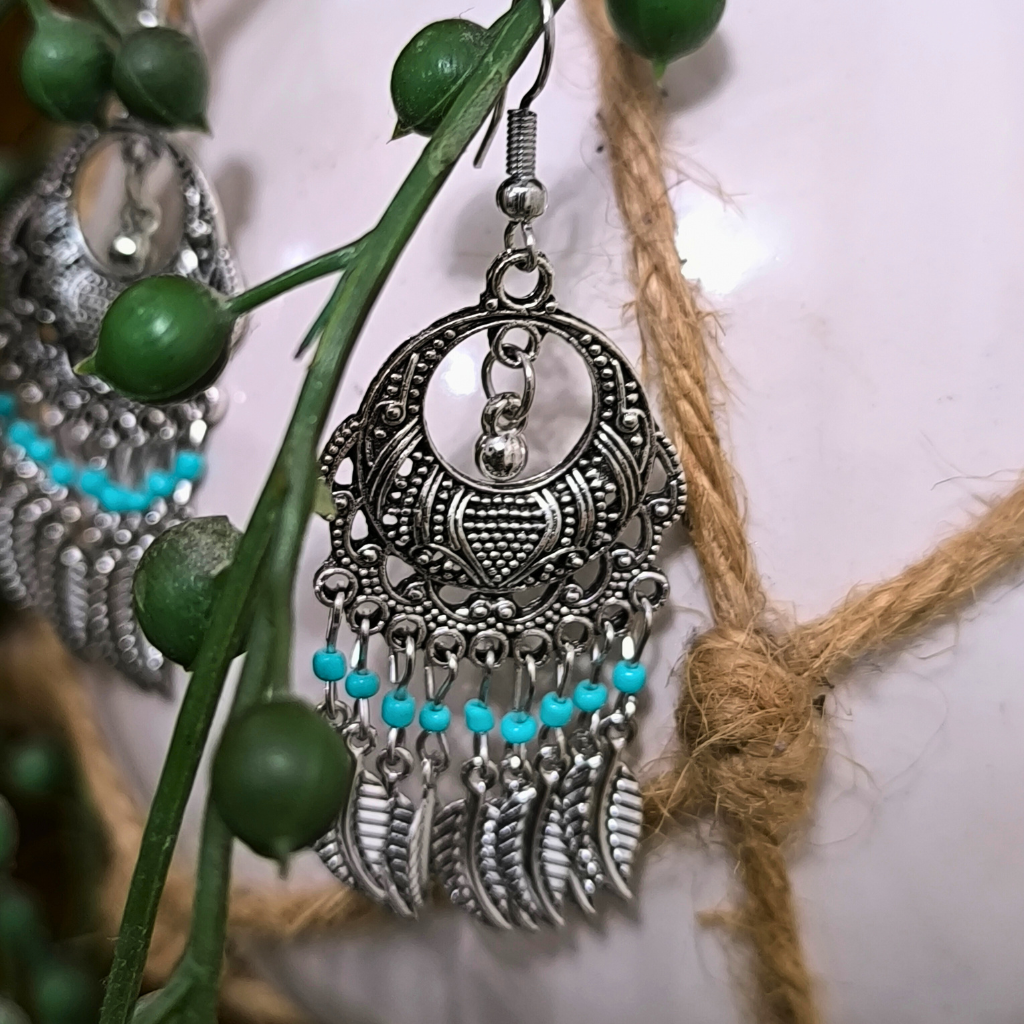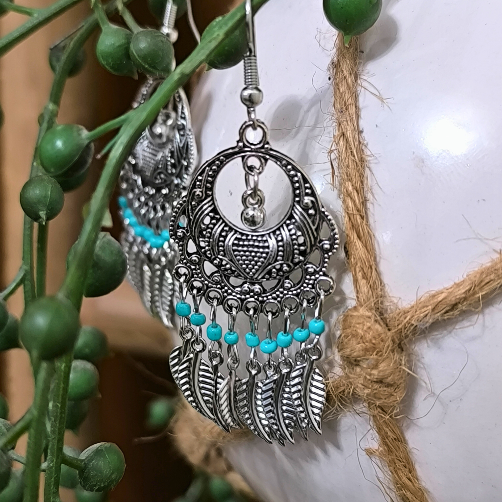 Ανακαλύψτε τη μαγεία του bohemian στυλ με αυτά τα μοναδικά σκουλαρίκια που συνδυάζουν το μπλε τυρκουάζ με ασημένια μεταλλικά στοιχεία.