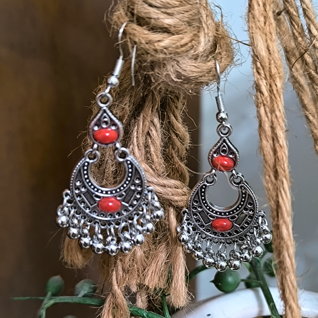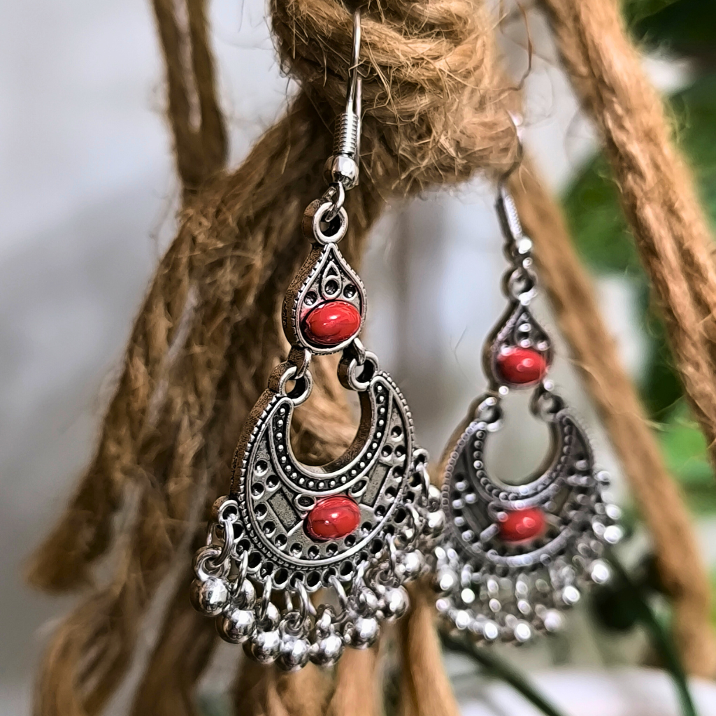 Ανακαλύψτε τη μαγεία του bohemian στυλ με αυτά τα μοναδικά σκουλαρίκια που συνδυάζουν το κόκκινο χρώμα με ασημένια μεταλλικά στοιχεία.